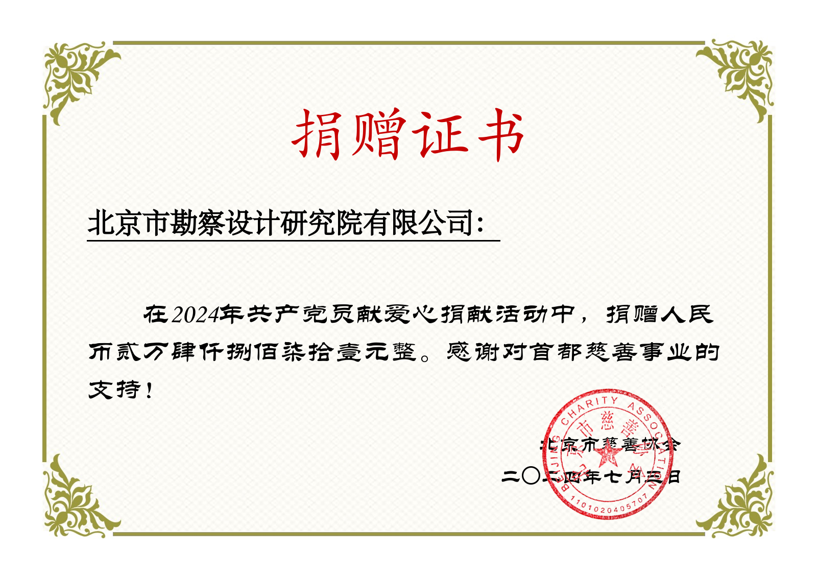 自1998年以來,我院連續27年榮獲“首都文明單位標兵”稱號,2009年榮獲“全國精神文明建設工作先進單位”稱號,2020年榮獲第六屆“全國文明單位”稱號。我院始終堅持圍繞“企業整體可持續價值最大化”的價值理念和對社會負責的企業品牌觀,開展精神文明建設工作,主動強化社會責任擔當,積極融入國家“一帶一路”倡議,踐行京津冀、雄安新區、大灣區、長江經濟帶發展戰略,立足首都城市功能定位,引領行業健康發展,承擔大量重難點工程和社會服務項目。發揮技術優勢,攻堅克難,積極投身“23·7”特大暴雨災害的水毀隱患排查治理等災后應急處置工作,踴躍支持社會公益事業,組織青年志愿者服務隊伍,連續多年組織開展“共產黨員獻愛心”和職工義務獻血活動,塑造崇德向善的精神風貌。