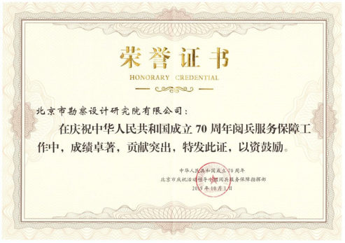 2019年11月20日,中華人民共和國成立70周年北京市慶祝活動領導小組閱兵服務保障指揮部發來榮譽證書,表彰我院在閱兵服務保障工作中圓滿完成道路專項空洞檢測任務,成績卓越、貢獻突出。從2009年慶祝建國60周年閱兵,到2015年抗戰勝利70周年閱兵,再到2019年新中國成立70周年閱兵,北勘院用一往無前的奮斗精神和嚴謹科學的工作作風,為首都的城市安全運營貢獻智慧和力量。
