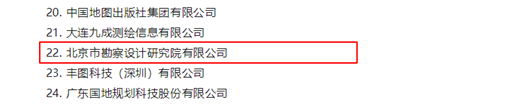 近日,中國地理信息產業協會公布2023年地理信息產業百強企業名單和2023年地理信息產業優秀工程獲獎項目,北勘院連續三年獲評地理信息產業百強企業(本年度排名第22名),參與的兩項工程獲評優秀工程金獎。