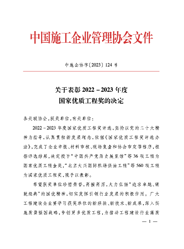 日前,中國施工企業管理協會公布2022-2023年度國家優質工程獎獲獎名單,北勘院作為勘察單位完成的中國共產黨歷史展覽館、北京環球影城主題公園(一期)、中信大廈、國家速滑館4項重大工程榮獲國家優質工程金獎,北京大興國際機場供油工程、延崇高速公路(北京段)等8項工程榮獲國家優質工程獎。