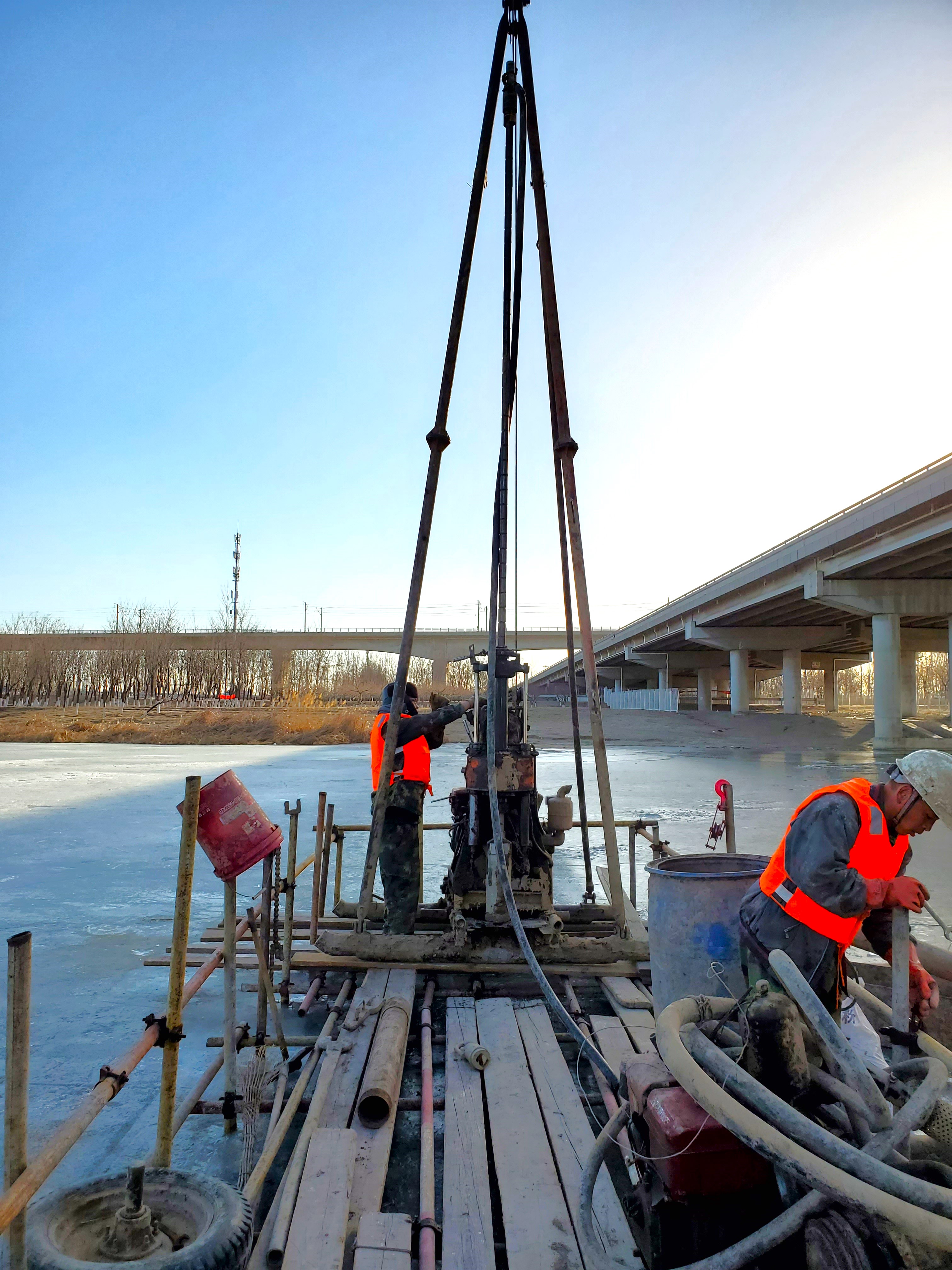 2021年1月,項目團隊頂住疫情和臨近春節用工緊張的壓力抽調20臺鉆機,春節不停工,在正月初四打響開局之戰,項目部全員舍小家為大家、不畏嚴寒堅守崗位。在刺骨寒風中鏖戰稻田水庫冰上鉆探,保障京雄二至六工區首開段的順利開工;