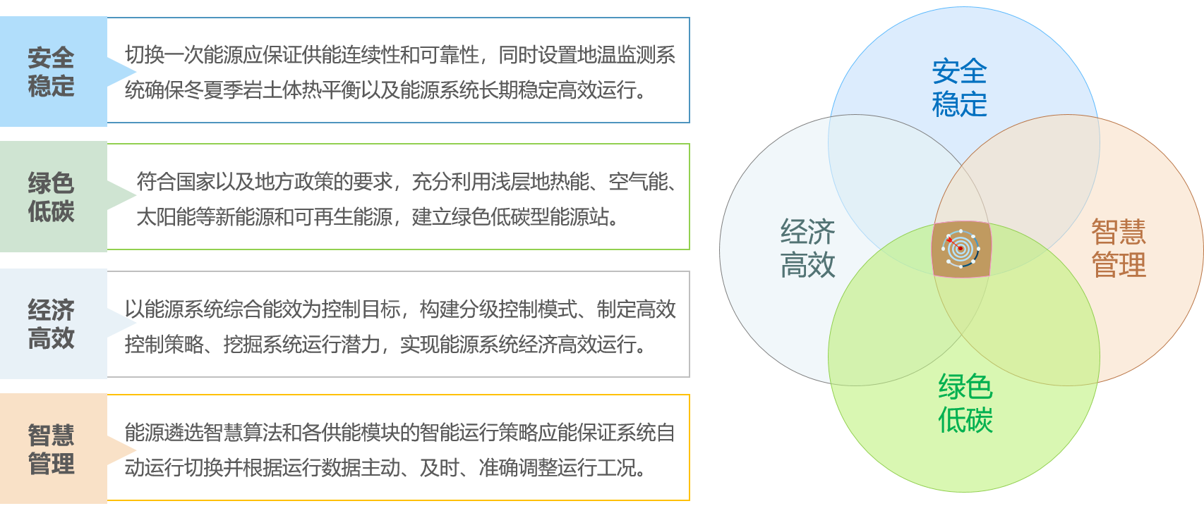 項(xiàng)目能源系統(tǒng)封裝了地源、空氣源以及能源輸送等多種節(jié)能技術(shù)算法和智能控制策略,形成以“冷卻側(cè)智追隨”“冷熱源側(cè)智尋優(yōu)”“輸送側(cè)智適應(yīng)”為主的綜合能源站整體節(jié)能技術(shù)體系。