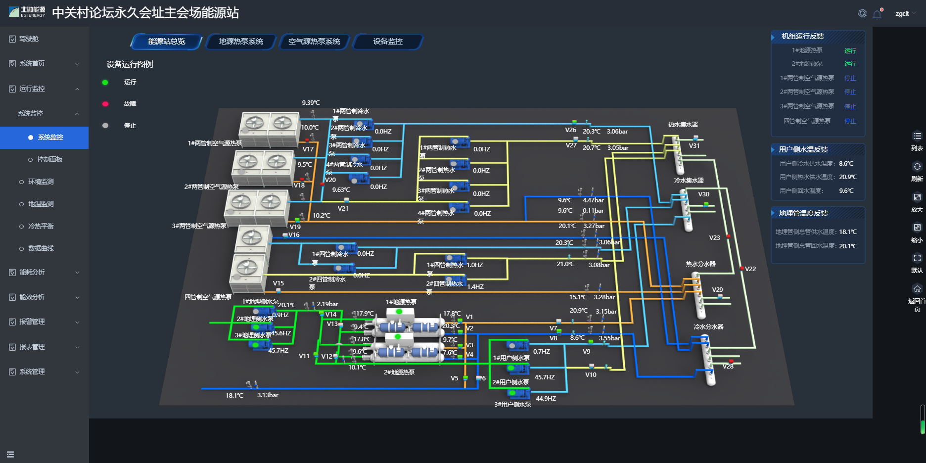 項(xiàng)目打造以地源熱泵為主的多能耦合能源站高效智慧能源系統(tǒng),智慧能源管理云平臺(tái)實(shí)現(xiàn)了本地智慧控制及云端遠(yuǎn)程管理,為多能耦合系統(tǒng)的智慧能源管理及數(shù)智化應(yīng)用提供“北勘能源方案”。