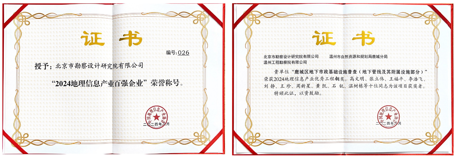 大會公布了2024地理信息產業百強企業,表彰了2024地理信息產業優秀工程。我院連續四年榮獲“2024地理信息產業百強企業”(2024年度排名第26名)稱號,完成的“鹿城區地下市政基礎設施普查(地下管線及其附屬設施部分)”項目獲“2024地理信息產業優秀工程銅獎”。