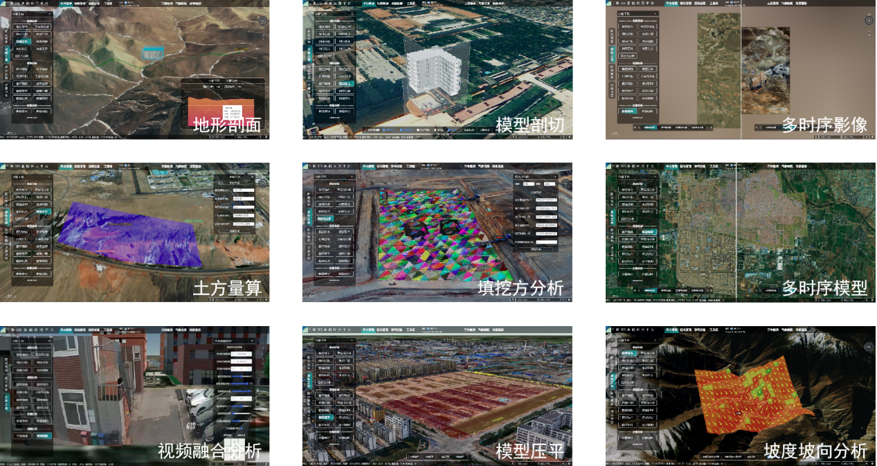 BGIS三維時空信息應用平臺以影像、地形、模型、視頻等多源數據為基礎,構建出時空數字底座,該平臺目前已包含30余項空間分析功能模塊。通過GIS空間分析算法,實現地形剖面分析、模型剖切分析、土方量算、填挖方分析、多時序影像及模型、視頻融合等強大的GIS分析功能,為工程應用提供強有力技術支撐。