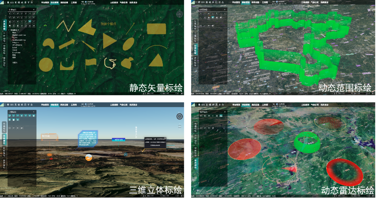 平臺內置靜態(tài)矢量、動態(tài)范圍、三維立體、動態(tài)雷達四類標繪模塊,研發(fā)50余種二三維地理要素標繪,實現標繪要素空間與屬性信息入庫,滿足多方面的場景要素標繪需求,助力構建豐富的三維場景地理信息要素。
