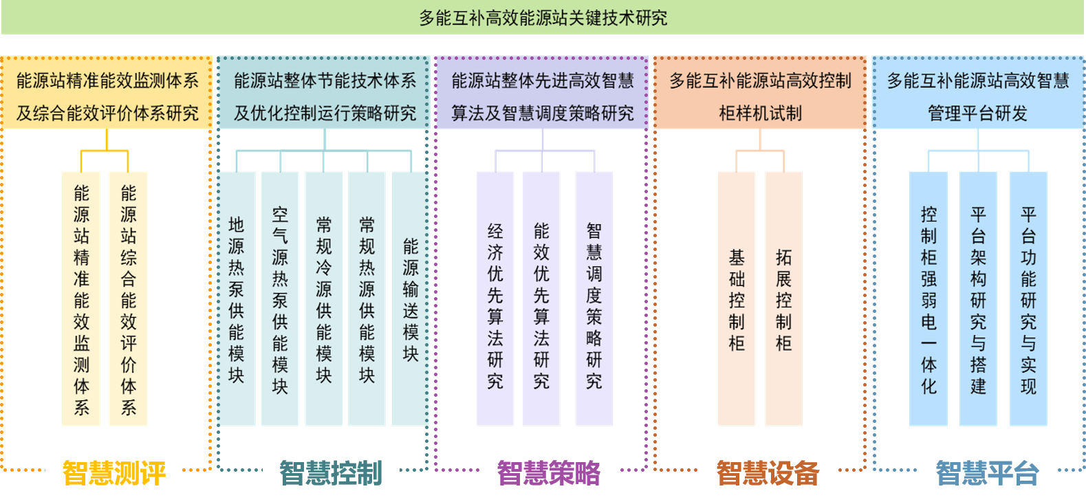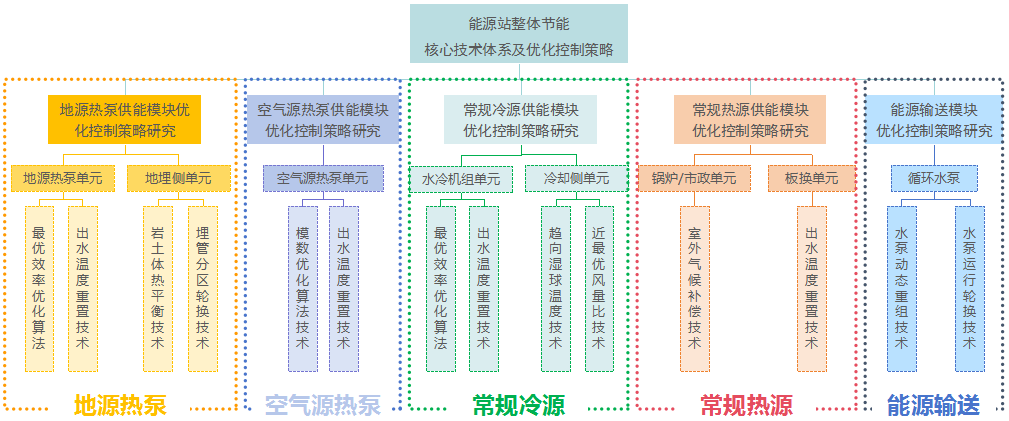 研發不同供能子模塊及輸送模塊的多種節能技術算法和智能控制策略,形成了以“冷卻側智追隨”“冷熱源側智尋優”“輸送側智適應”為主的多能互補能源站整體節能技術體系。